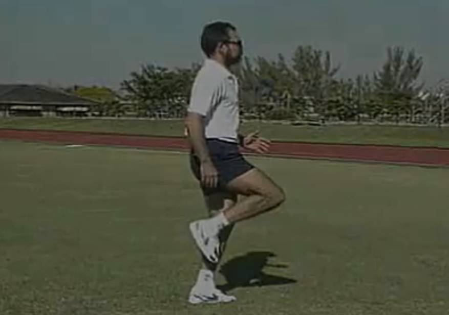 利用肌肉弹性让支撑脚自然上拉,重点在于把腿提拉起来的动作,这样可以减少支撑腿转换时的能量消耗。这是学会利用肌肉弹性最好的练习。