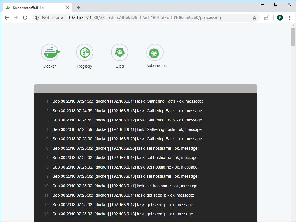 当你看见Docker图标颜色变为绿色的时候,表示所有节点的docker已经能正常运行,此时可以不等后续部署过程结束,立刻去所有k8s master节点进行HA组件的启用:
