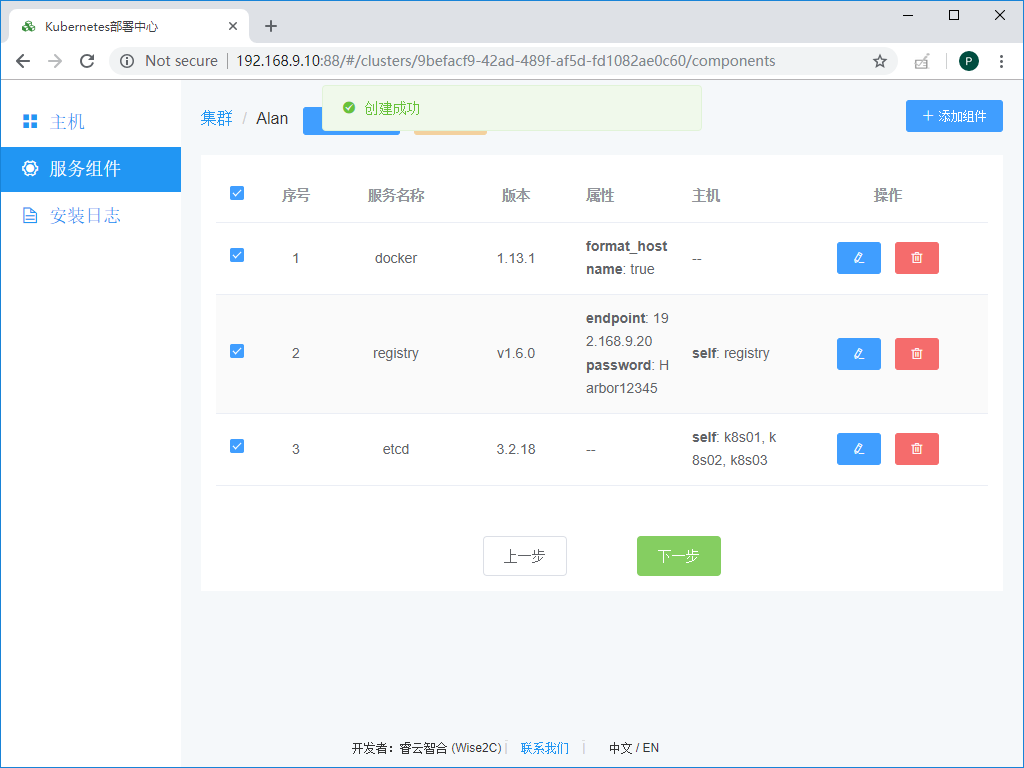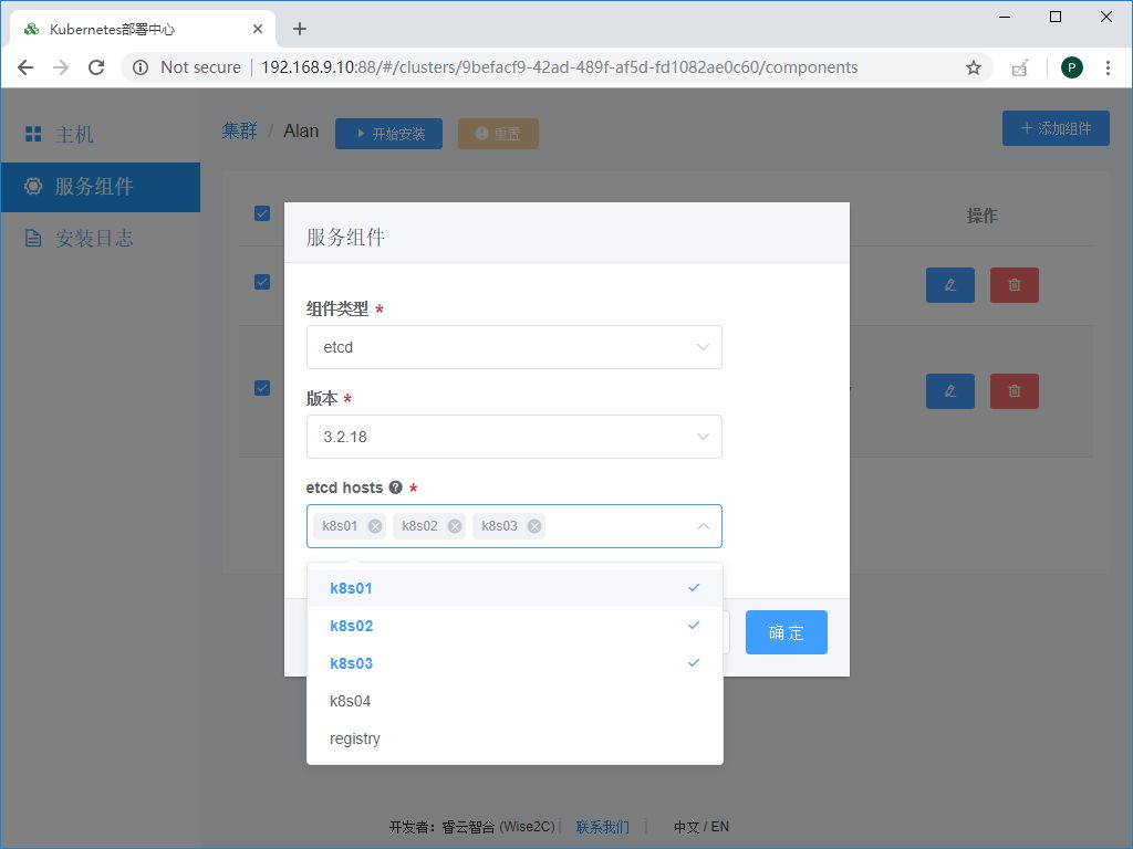 继续添加etcd组件,这里我们将其合并部署于k8s master节点,也可以挑选单独的主机进行部署: