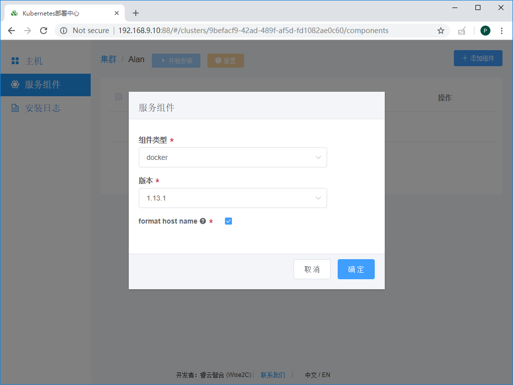 (3)点击右上角“添加组件”按钮添加服务组件,选择docker,因为所有主机都需要安装,因此无需选择服务器: