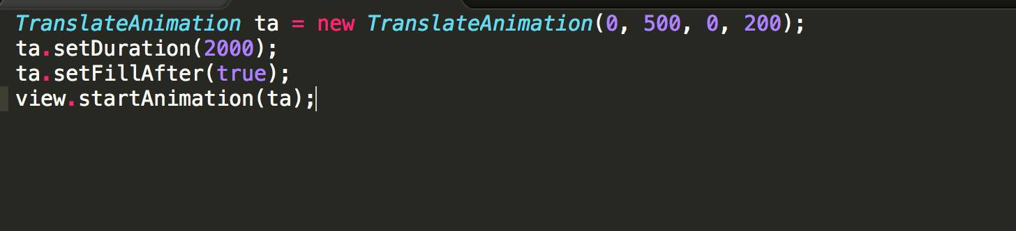 ObjectAnimator .ofFloat(view,"translationX",0,500) .setDuration(2000) .start(); ObjectAnimator .ofFloat(view,"translationY",0,500) .setDuration(2000) .start();
