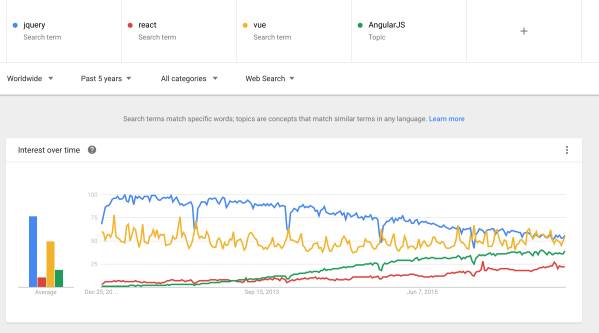 Web 框架上,从 Google 查询关键字的大势看,jQuery 时代已慢慢离我们而去。Web 前端框架已基本三足鼎立,分别是 React / AngularJS / Vue。让人想不到的是 AngularJS 查询指数最多的地区不在欧美,也不是中国,而是在「印度」。