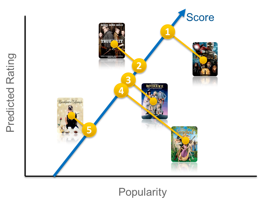 and w2 in our model (the bias b is constant and thus ends up not affecting the final ordering). In other words, in our simple two-dimensional model, how do we determine whether popularity is more or less important than predicted rating? There are