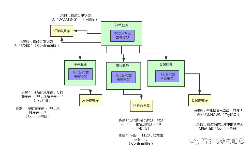 这个时候,就需要依靠TCC分布式事务框架来推动后续的执行了。