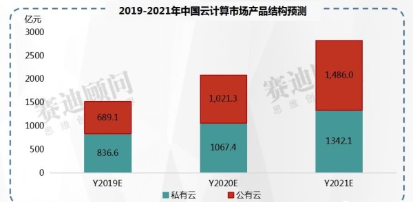 从细分市场结构来看,目前公有云市场占比低于私有云,但是增速较快,市场占比呈逐年上升趋势,预计到2021年,公有云市场规模将达到1486.0亿元。