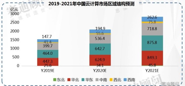 未来三年,区域结构的总体格局基本保持不变,到2021年,华北、华东、中南仍然占据最大比重,这些区域企业的云化水平将会进一步提升,大数据、物联网等新兴的应用落地和发展也主要集中在这些区域。