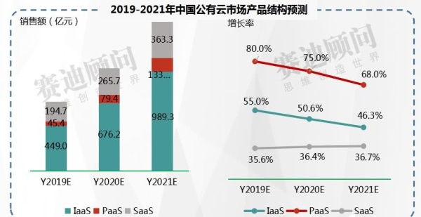 未来,随着大数据、人工智能、行业应用的持续推进,IaaS将呈现快速增长势头,至2021年,市场规模将达到989.3亿元;PaaS增速最快,至2021年,市场规模达到133.4亿元,占公有云市场比例将达到9.0%;SaaS增速最慢,但增速呈缓慢增长趋势,到2021年,市场销售额达到363.3亿元。