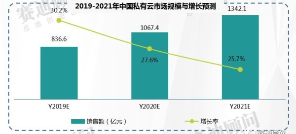 私有云在我国占据较大份额,预计未来3年仍将保持在20%以上的增长率,到2021年,市场规模将达到1342.1亿元。