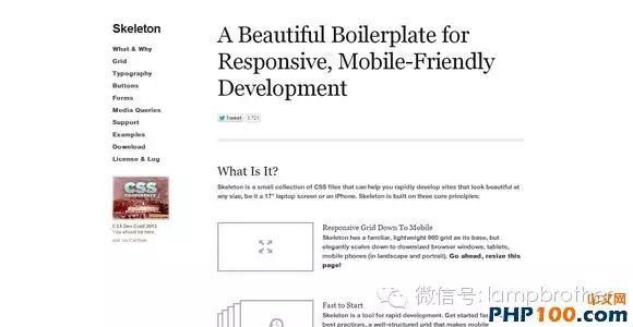 Skeleton有着简单、界面友好的特点,有一系列CSS和JS文件的集合,它可以帮你快速地调整网页在不同分辨率下的显示效果,可以优雅地等比例缩放桌面、平板、手机上的浏览尺寸。