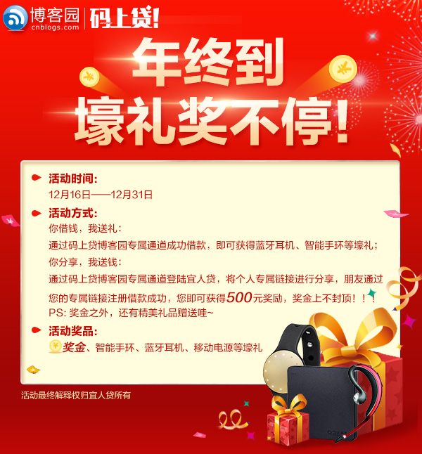 通过码上贷博客园专属通道成功借款,成功借款5万以上即可获得Misfit Shine智能手环一个,5万以下可获得Jabra WAVE蓝牙耳机一副;