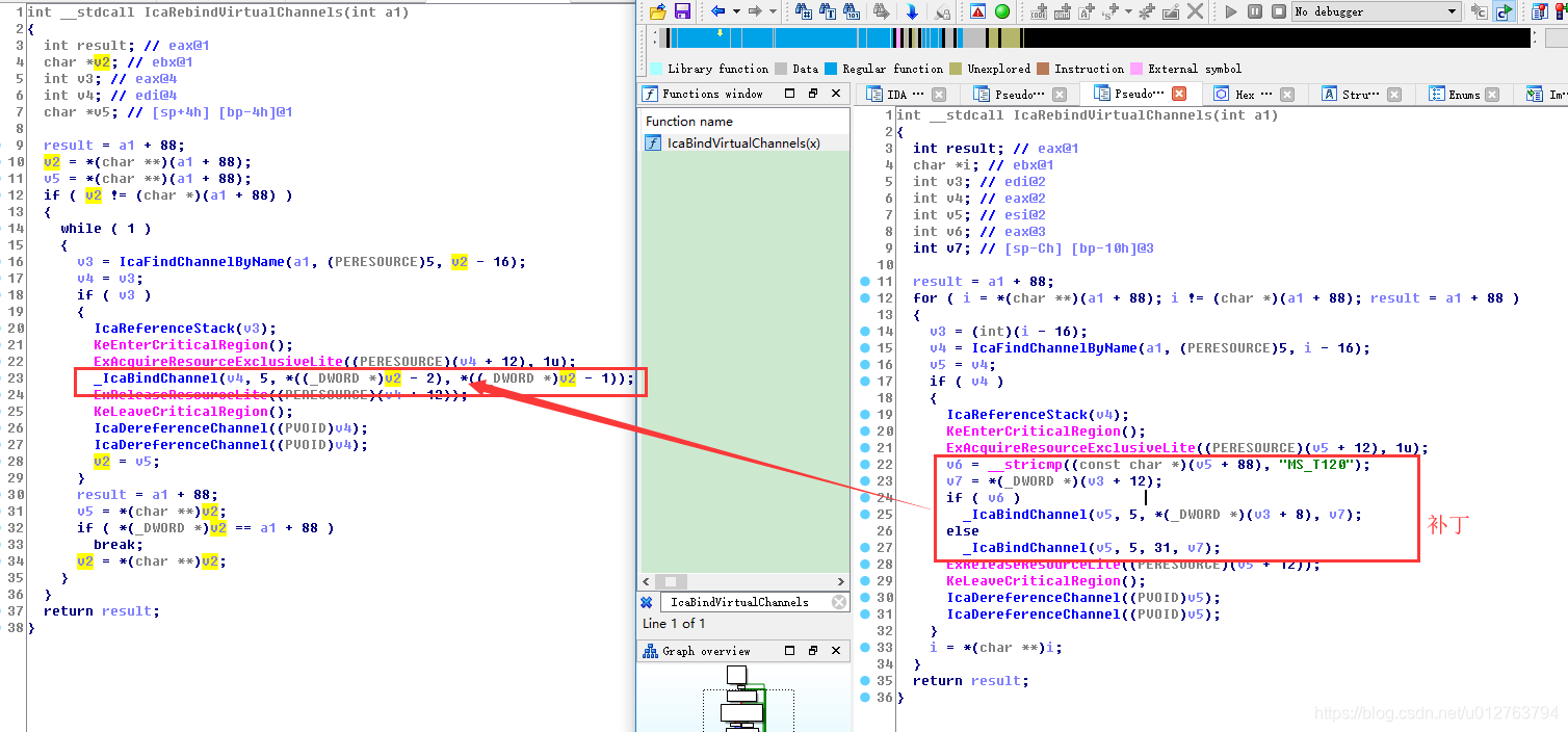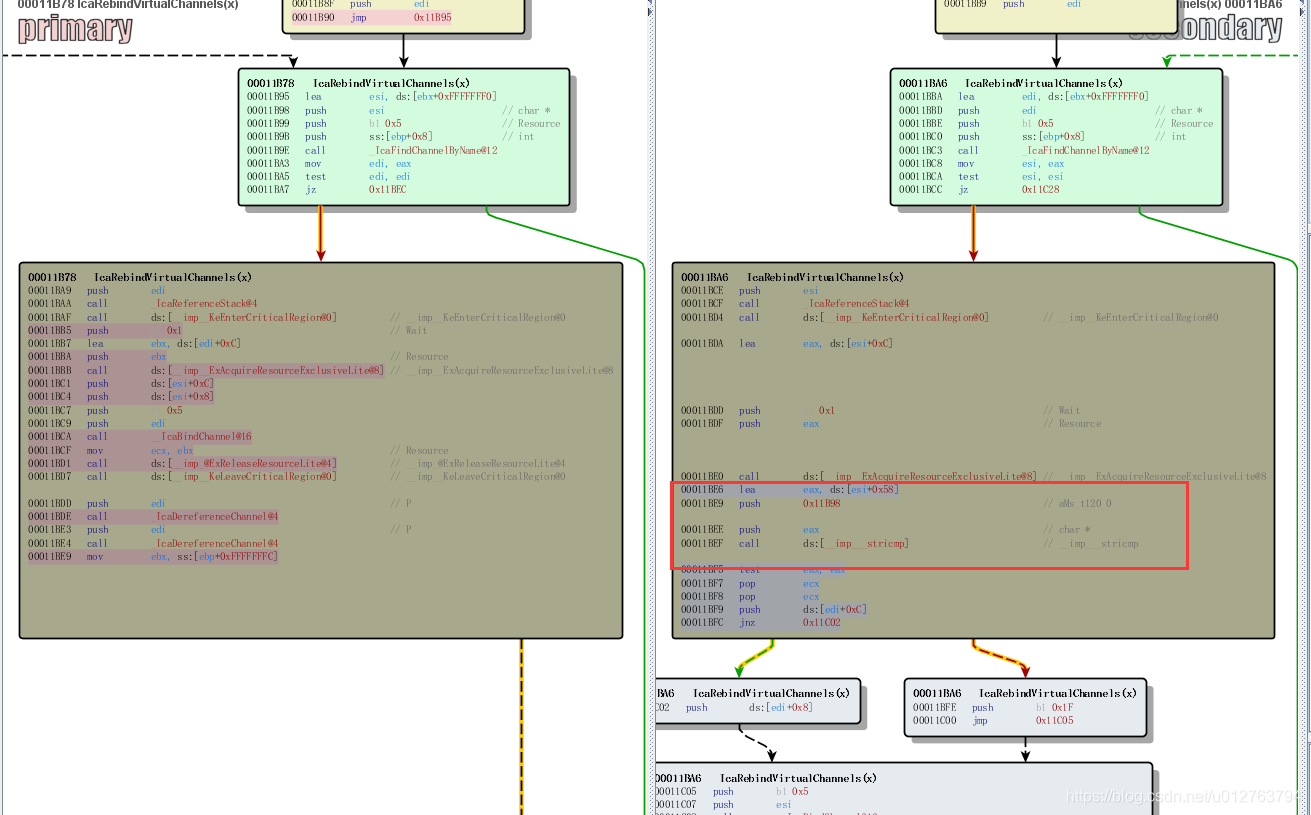 上神器对比,可以看到改了两处——IcaRebindVirtualChannels和IcaBindVirtualChannels