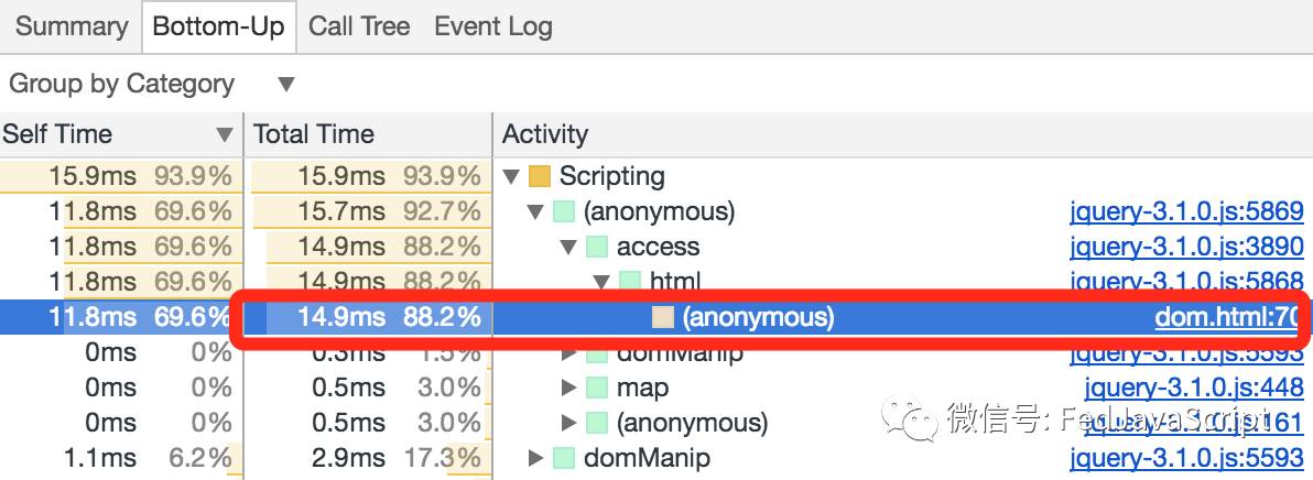 由下图可看出主要为dom.html中的js执行占用时间。