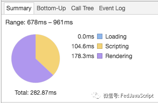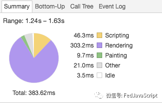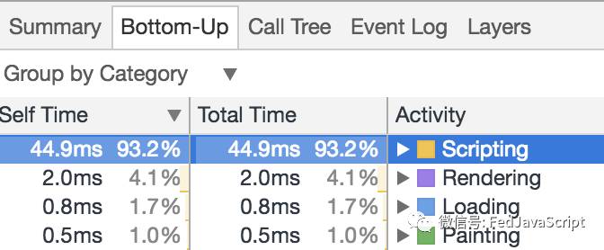 由上图可以看出,耗时最大的在scripting,js的执行时间达到了44.9ms,占总时间的93.2%,因为主要靠js计算控制DOM的显示内容,所以js运行时间过长。