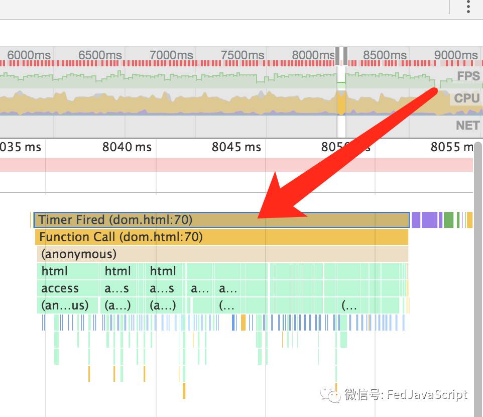 优化前的代码对DOM操作很频繁,因此FPS值普遍偏低,而优化后可以看出红色方块明显减少,FPS值一直处于高值。