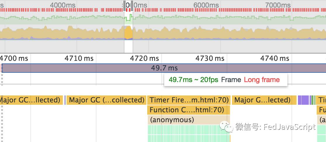 由上图可以看出,在文字滚动过程中红色方块出现频繁,页面中存在的卡顿过多。帧率的值越低,人眼感受到的效果越差。