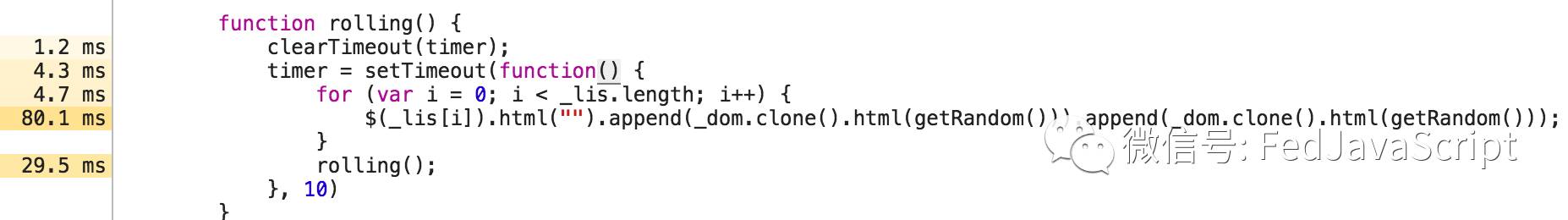 由此可知,主要是rolling这个函数执行时间过长,对该部分失帧影响较大。而这个函数的主要作用就是实现文字的滚动效果,也可以从代码中看出,这个函数利用的setTimeout来反复执行,并且在这个函数中存在着循环以及大量的DOM操作,造成了页面的失帧等问题。