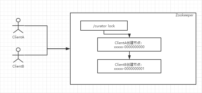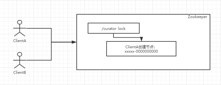假设两个客户端ClientA跟ClientB同时去争夺一个锁,此时ClientA先行一步到达zk,那么它将会在我们的zk上创建一个“/curator_lock/xxxxx-0000000000”的临时顺序节点。