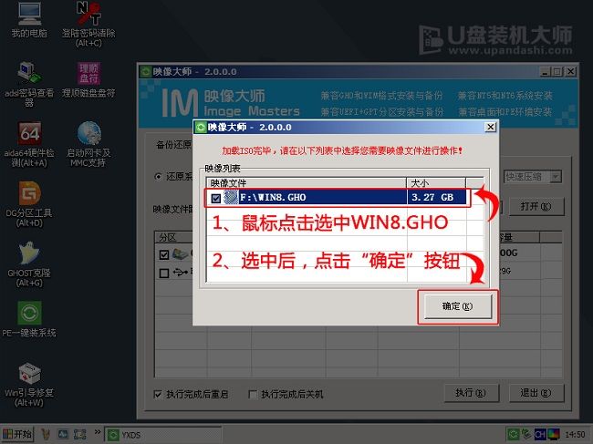 进入PE桌面后,用鼠标双击“PE一键装系统”图标,将打开“映象大师”软件。