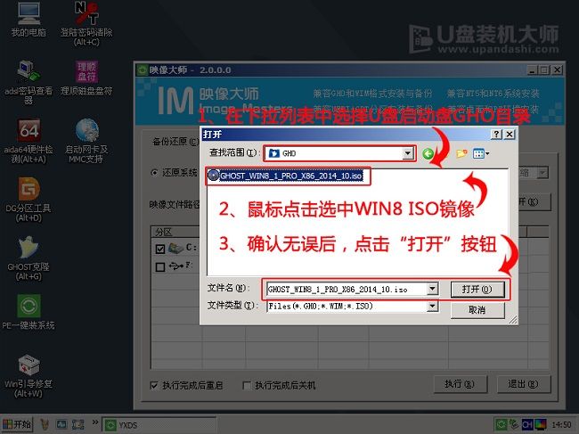 4、在弹出窗口中,首先通过下拉列表选择U盘启动盘的GHO目录;然后选择刚才拷贝进去的Windows8系统镜像;确认文件名无误后,点击“打开”按钮。
