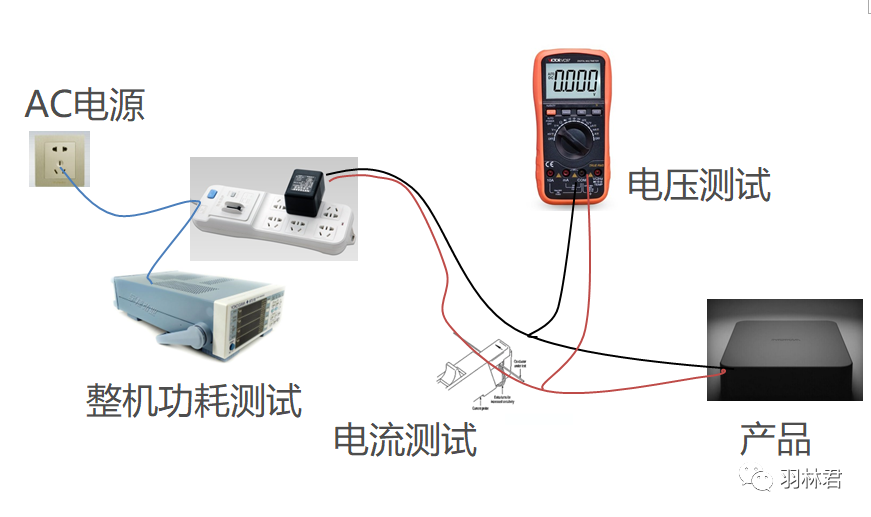 整机功耗:完整的产品形态,在电源适配器AC输入端测得的功耗,因为电源适配器有一定的电源转化效率及损耗,所以要计算在内。