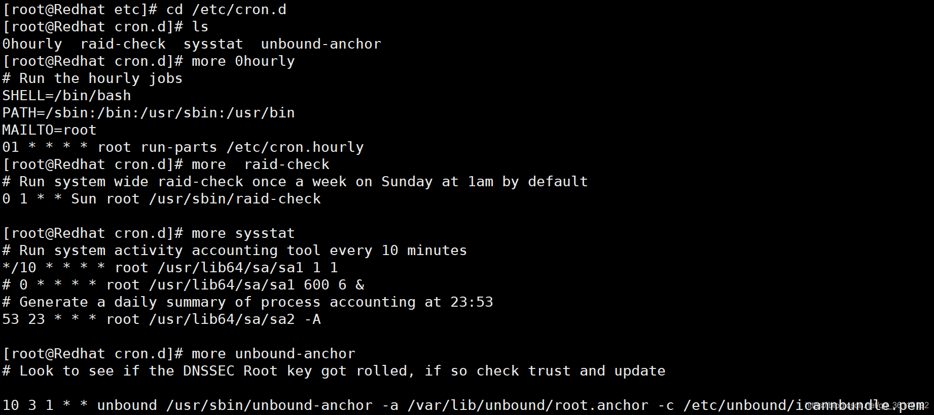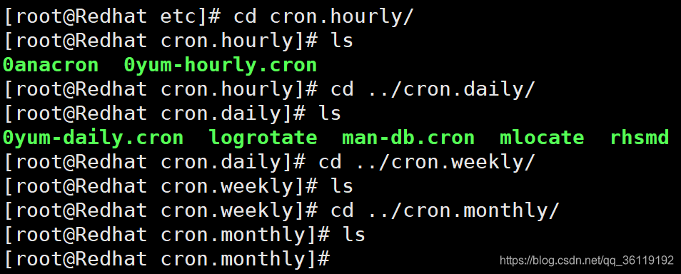 /etc/cron.(hourly/daily/weekly/monthly) 是四个目录,目录内存放着一些定时任务。只有root用户有权限在该目录下创建定时任务文件,这四个目录下的定时任务格式如下,直接写脚本文件即可。创建完成后,需要赋予该文件可执行权限x。这四个目录/etc/cron.(hourly/daily/weekly/monthly)下的脚本分别每小时、每天、每周、每月执行。