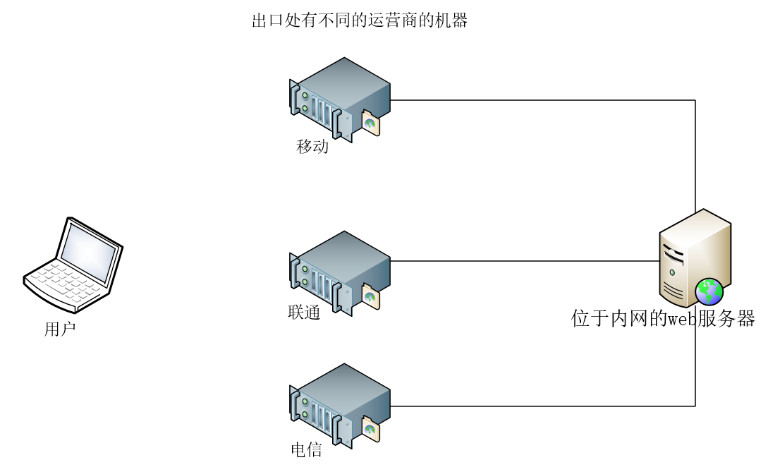更大型的企业,出口处有几个运营商,提供热备份和负载均衡。这时,我们通过域名查询ip地址可以找到3个ip地址。但是这3个ip地址都是出口处运营商的ip地址,并不是真正的web服务器的ip地址,真正的web服务器在内网中。