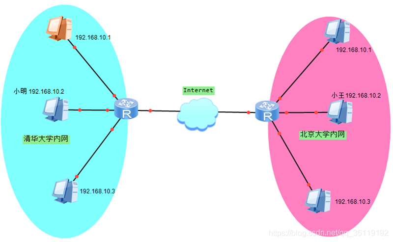 如下图,有这么一个环境。小明和小王分别是清华和北大的学生。他们都各自处在自己学校的内网中,他们的ip地址可以是一样的,都是192.168.10.2。清华大学的小明想约北京大学的小王晚上吃饭。于是小明想给小王发一个消息,约她晚上一起吃饭。那么,小明该如何给小王发消息才能让小王收到消息呢?小明只知道小王的ip地址和自己的一样,都是192.168.10.2。很显然,如果小明给192.168.10.2这个ip地址发消息,小王是肯定不能收到消息的。