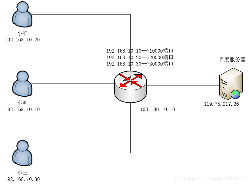 192.168.10.10:22222 <——> 119.75.217.26:80