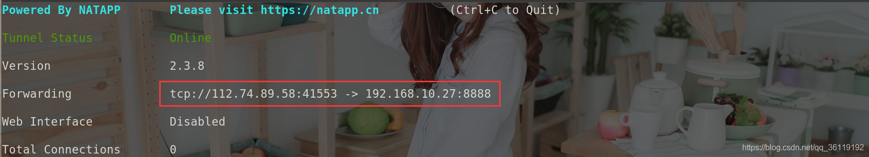 最后给大家看运行软件的截图,它把我本地192.168.10.27:8888 的端口映射成了公网的 112.74.89.58:41553 ,所以,我们就实现了内网穿透。任何发往 112.74.89.58:41553 端口的数据都会被我们的 192.168.10.27:8888的端口给收到!