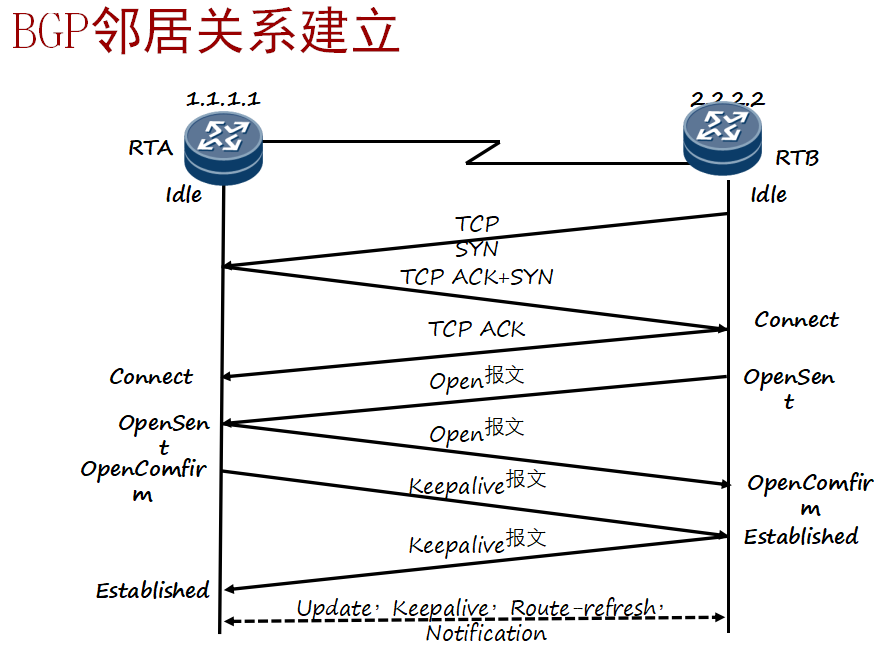 完成TCP三次握手后的状态是Connect,发送完Open报文的状态是Opensen,收到对方的Open报文的状态是OpenComfirm,收到对方的Keepalive报文的状态是Established。建立好了邻居关系之后,通过发送Update报文更新路由信息