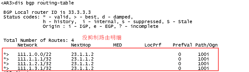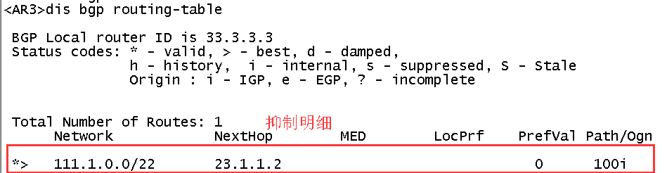 [AR2-bgp-af-ipv4]aggregate 111.1.0.0 22 detail-suppressed (抑制明细)
