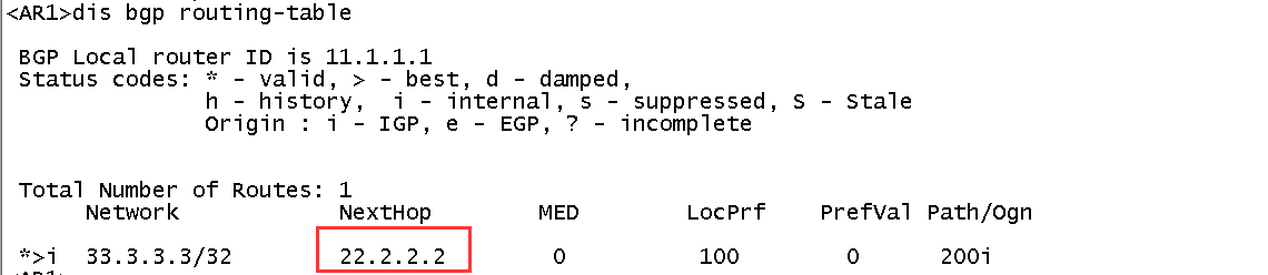 可是如果在R2上指定peer 11.1.1.1 的下一跳是本地的话,下一跳地址的话,就会发生变化了,那么下一跳地址就是R2了