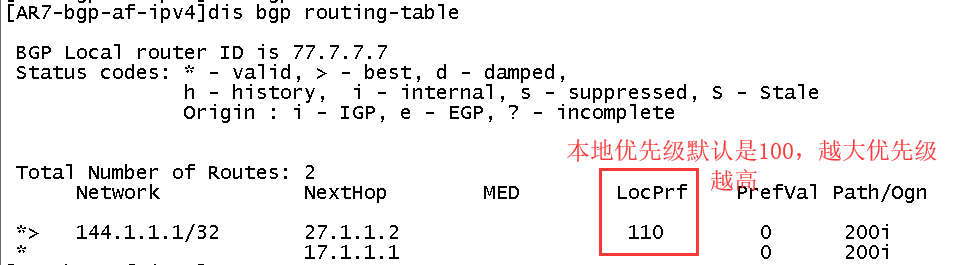 - 优选Preference_Value值最高的路由(私有属性,仅本地有效)。