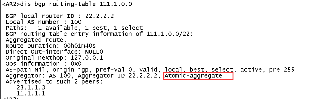 这个属性代表的是这条BGP路由是曾经被聚合而产生的。要抑制路由明细了才会显示原子聚合