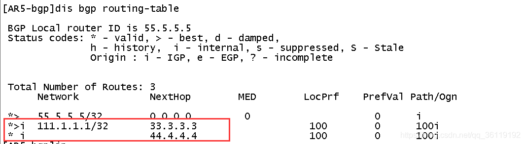 origin:起源代码,有三个 i-IGP e-EGP ?- incomplete。