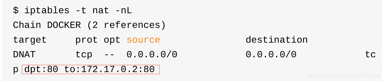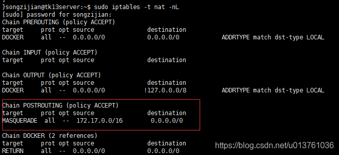 上面是所有源地址在172.17.0.0/16网段,目标地址是所有0.0.0.0/0,的流量动态伪装成从系统网卡发出。MASQUERADE 跟传统 SNAT的好处是它能动态从网卡获取地址。