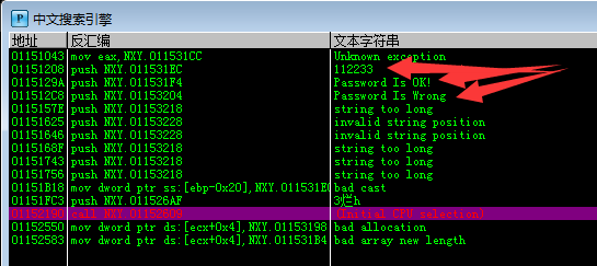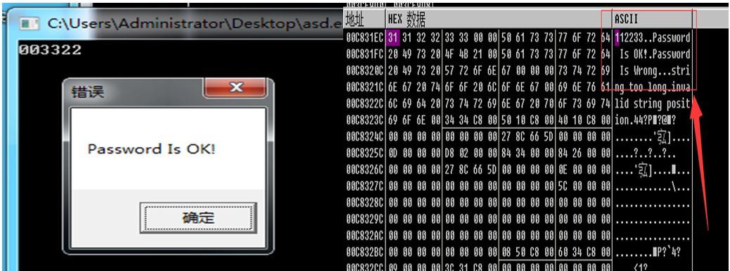 然后是上上个图的那个XXXXXXXX的位置,我觉得应该是做字符串比较呢,就是把输入字符串异或0x1之后和某个字符串比较。但是里面还没分析清楚,明天再说吧,今天来不及了。还有一个窍门就是知道是xor 0x1了之后我的所有输入字符串都是00000了。这样方便观察。最后偷了个懒。在查找Password。。。字符串的时候我看到了112233,那么可以猜测一把,输入串异或之后是和112233比较。所以直接112233异或1之后得到003322,然后测试一波: