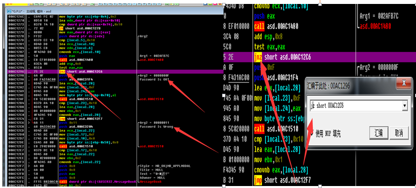 先第一个思路,直接破解密码校验的地方。直接改汇编代码。