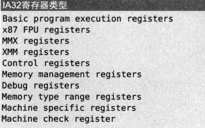 IA-32是英特尔推出的32位元架构,属于复杂的指令集架构,提供非常多的功能,并且支持多种寄存器。IA-32支持的寄存器类型: