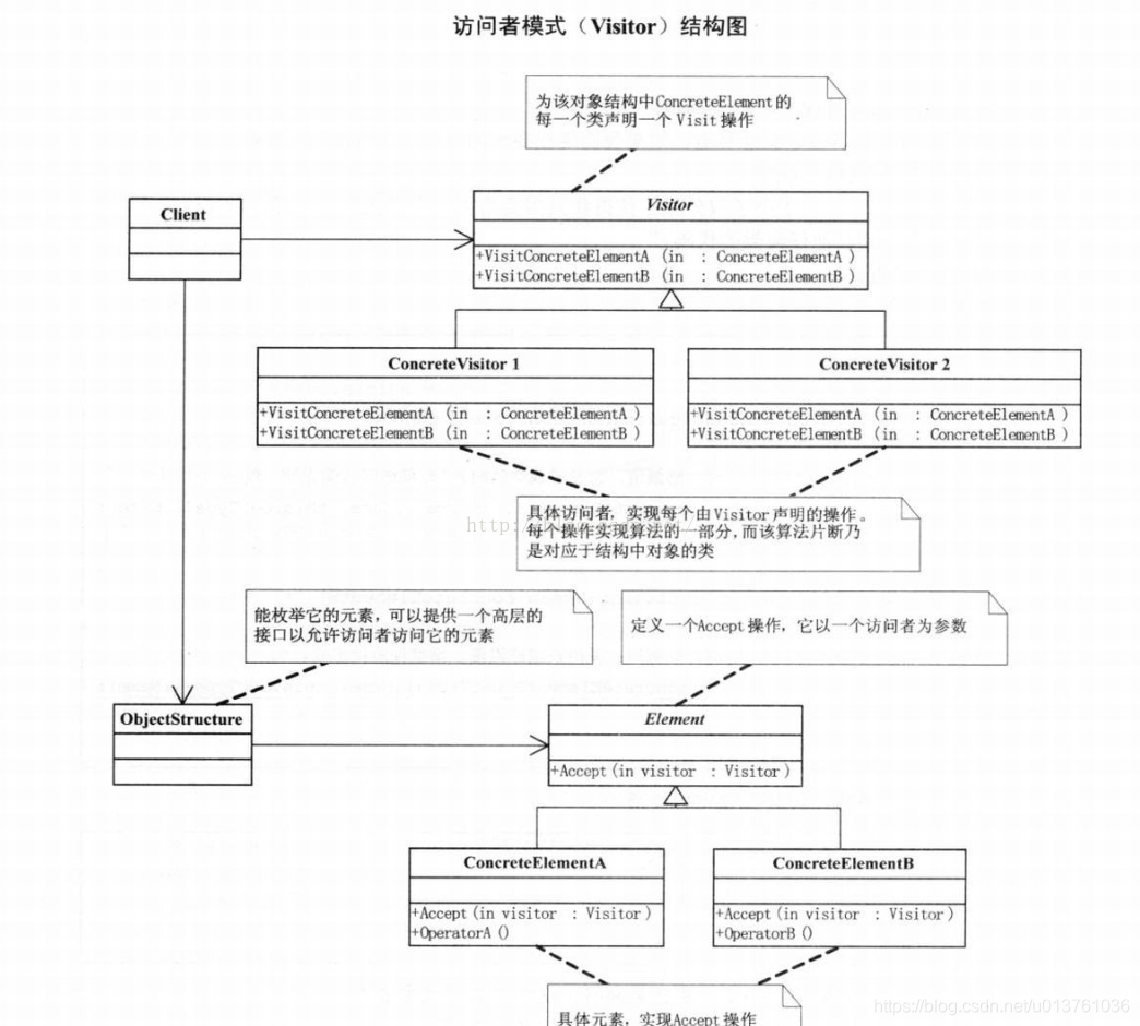 class CVisitor {//为该对象结构中ConcreteElement的每个类声明一个Visit操作。