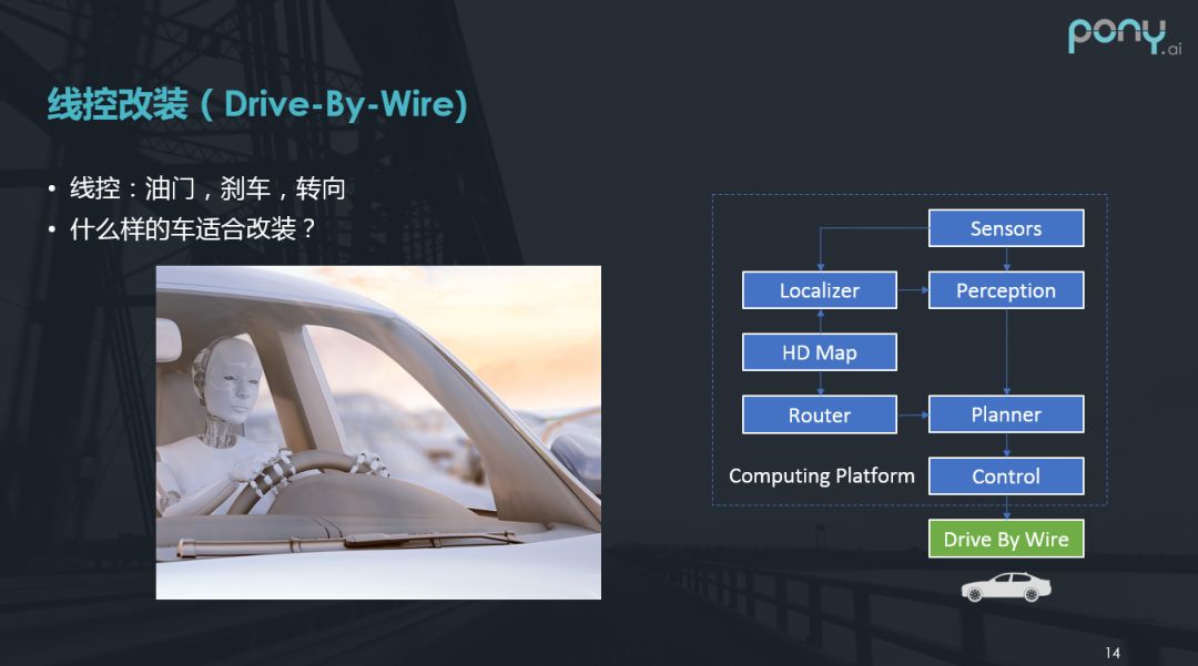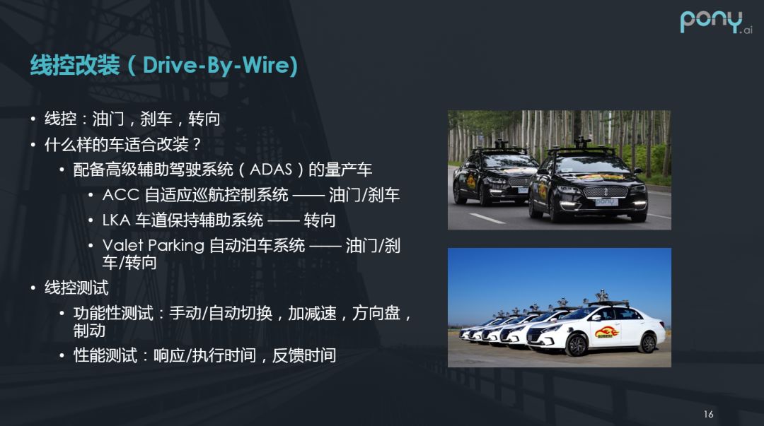 这些功能都是通过车辆底层控制协议来控制车辆的机械结构,我们只要想办法获得这些协议,就可以通过调用响应的接口达到我们的目的。由于这种改装方案对于原车的改动最小,响应的安全性也更高,目前被主流自动驾驶公司广泛接受。右边两张图是 Pony.ai 申请北京路测牌照选用的两款车,而选择的原因也正是因为他们有比较好的改装基础。