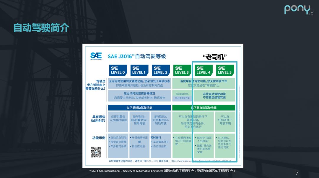 这张表是由 SAE(国际自动机工程师学会,是横跨航空航天、汽车、商用车工程行业领域的顶级标准制定者,起着监督确保产品及服务安全、质量及有效的角色。)提出的。SAE 自动驾驶分级标准第一版J3016于2014年1月发布,最新的一次修订版发布于2018年10月,标准中 SAE 将自动驾驶技术分为 L0-L5 共六个等级:L0 代表没有自动驾驶加入的传统人类驾驶,而 L1-L5 则随自动驾驶的技术配置进行了分级:分别为辅助驾驶、部分自动驾驶、条件自动驾驶、高度自动驾驶、完全自动驾驶。