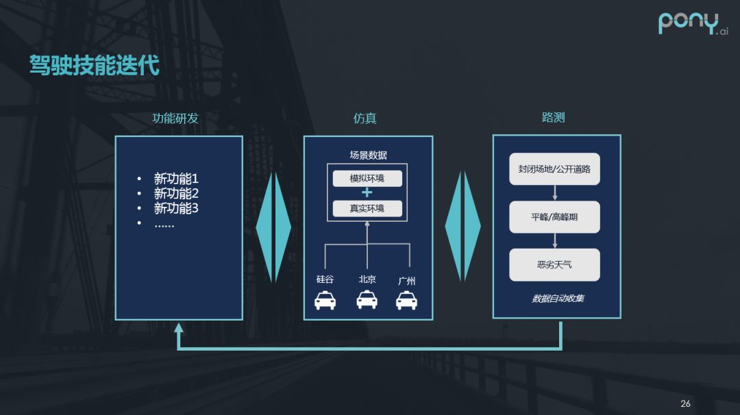 这是 Pony.ai 内部功能开发的一个基本流程,一个新功能从 idea 被提出到代码实现基本需要经过以下流程:首先,在功能开发完成之后需要先在内部的模拟环境中充分测试,我们的模拟环境包含丰富的测试场景,这其中的测试场景有的来自于程序生成,有的来自于之前的真实路测。在完成仿真测试之后,需要进行实车路测,为了保证系统的平稳迭代和发布,我们会随着功能的稳定程度的提升一步步增加路测环境的复杂程度。在实车路测的全部数据都会被很好记录并被有效追踪,其中暴露出来的问题会被重新加入到仿真环境的测试样例中,直到现有版本通过所有测试,才可以进行下一次路测流程。只有当一个功能在之后的路测中被测试了足够长时间并且没有问题,我们才会将它作为稳定版本发布。