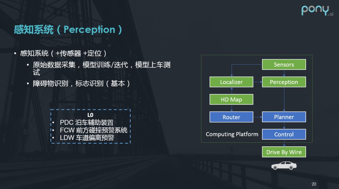 讲到这儿,我们的车有了基本的感知能力,虽然我们还没有控制车辆,但是已经可以对于车辆周围的危险进行一些基本的警示,这就是目前一些车辆 L0 级别功能的思路,包括 PDC(我们俗称的倒车雷达),FCW(前方碰撞预警系统),LDW(车道偏离预警系统)。当然,这些系统并不要求有高精度地图以及线控。