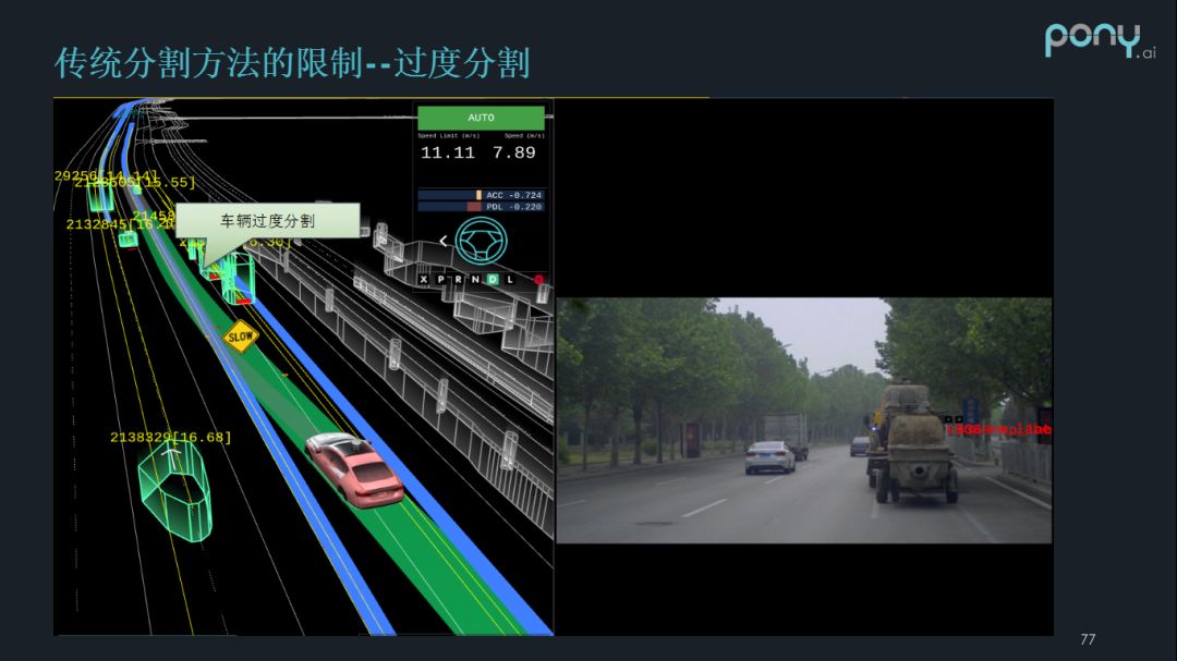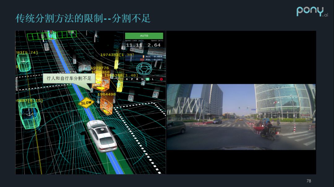 2. 分割不足:这个是 Pony 感知在早期出现的一个问题,我们称之为“三人成车”,就是当三个人离的很近的时候,很容易被系统识别成一辆车。
