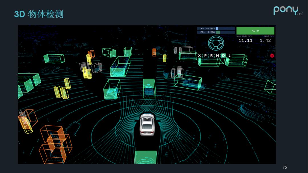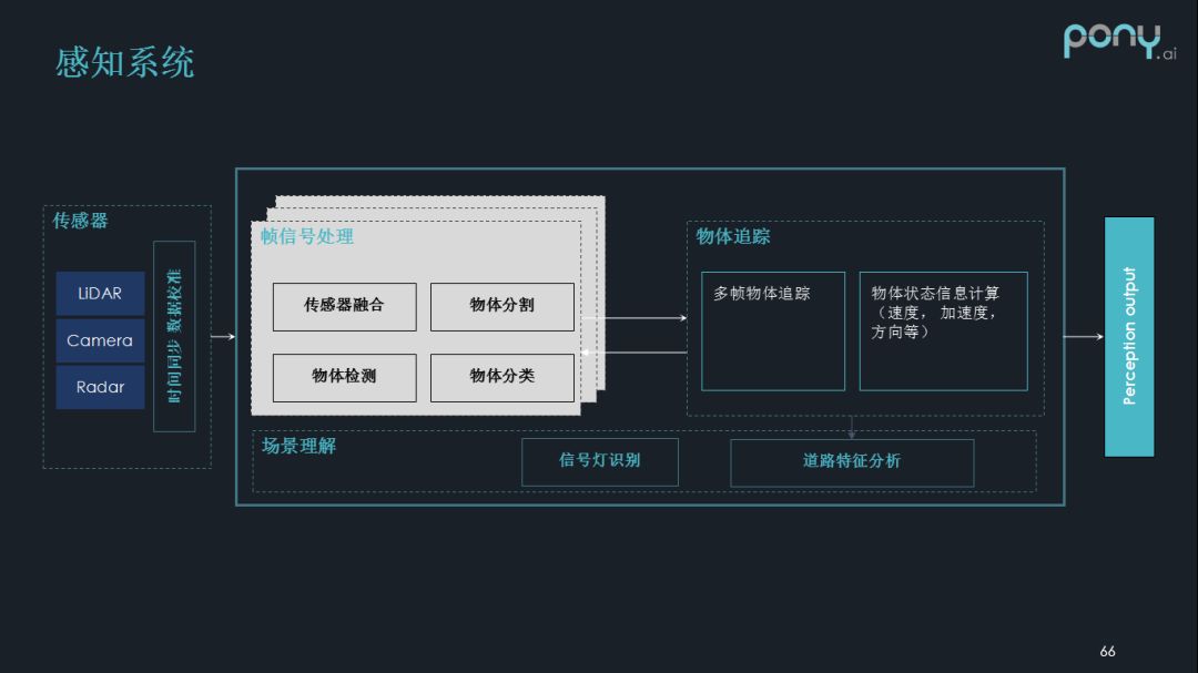 首先介绍下 Pony 感知系统。感知可以认为是对周围世界建模的过程,比如车辆在行驶过程中,需要知道物体的地理位置、速度、运动方向、加速度等各种各样的信息,接收这些信息之后,再通过后续的规划和控制模块,来对车的运动做真正的调节。