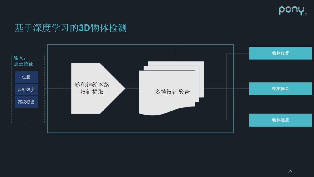 为了解决这些问题,就把一些深度学习跟卷积神经网络引入到 3D 物体检测中来。把点云信息进行特种工程,比如把点的位置、反射强度、高级特征聚合在一起,组织成类似图片或者图的关系,然后进行卷积神经网络特征提取,再进行多帧特征的聚合(它的意义是对运动的物体有一个更好的反映),最后得到物体的位置、聚类信息、物体速度。