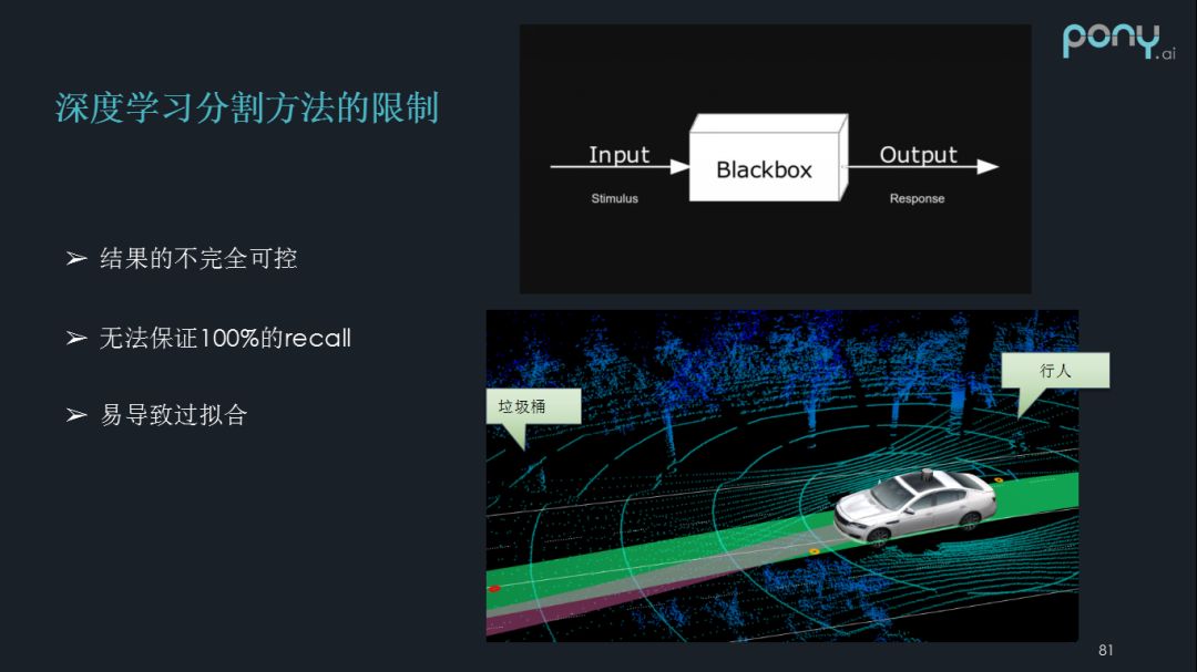 1. 结果的不完全可控:首先卷积神经网络经常有几百层的卷积层,参数总量可能有百万级,并且是自动学习的,导致对网络的输出没有很好的把控,就是我们无法预期 input 数据输入之后会得到怎样的数据,这在自动驾驶领域是比较致命的,因为自动驾驶是对召回率和精度有非常高要求的场景,比如车辆在行驶中,前面的一个人被 miss 掉,可能就是件严重的事件。