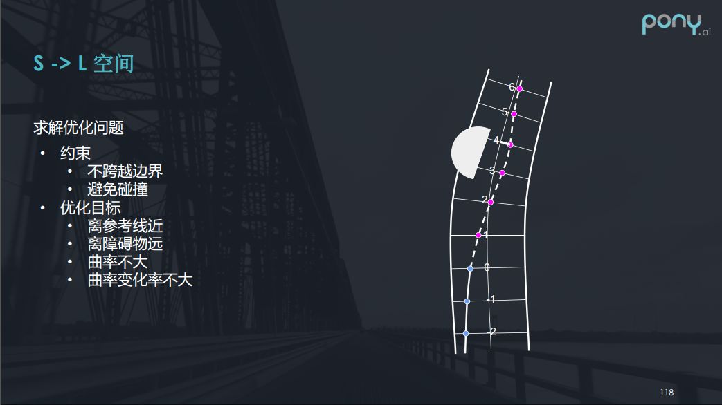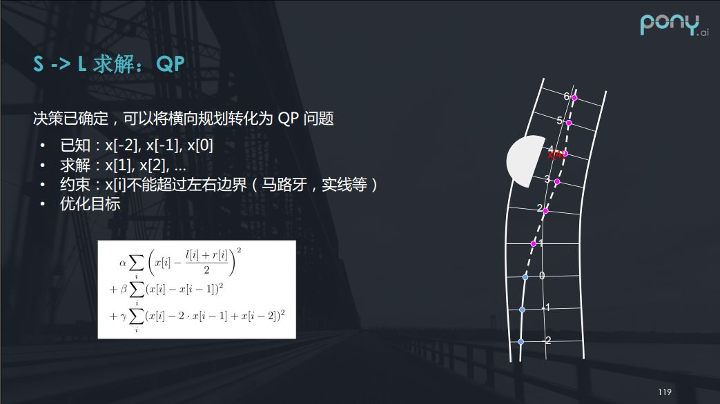 有了参考线之后我们就可以把参考线离散化,采一些点出来,那么就变成了解一个离参考线偏移距离的一个问题。就变成了s ->L的问题,约束是不跨越边界,避免碰撞,而优化的目标是要离参考线近,要离障碍物远,曲率不大,曲率变化率不大等等。