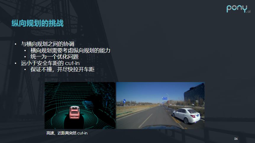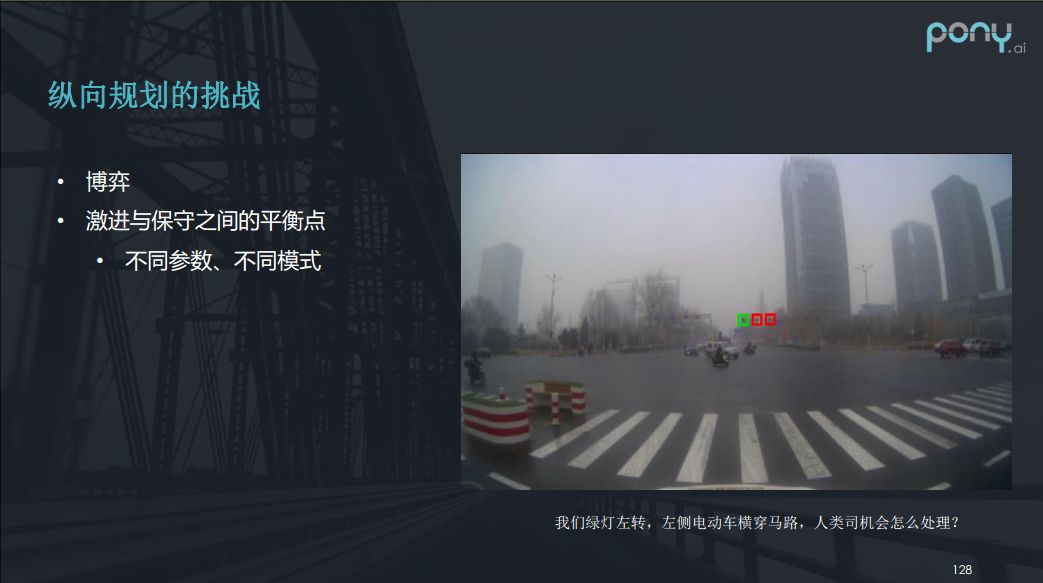 之后我们再看一下纵向规划的挑战。如下图,比如我们绿灯左转,而有一个电动车,在左侧很快速的横穿马路,正常来说那么人应该怎么开呢?人会和电动车司机对一下眼神,通过眼神比较气势谁猛,然后谁就会主动的让对方,开个玩笑。但在决策上是这个事情并不好处理,这是一个博弈的过程,并不能一开始就决定要无视他还是让他,而要在一开始对他有一点反应,所以在很多时候要在激进和保守之间掌握一个平衡点,很多时候要有不同的参数和不同的模式去处理这个事情。